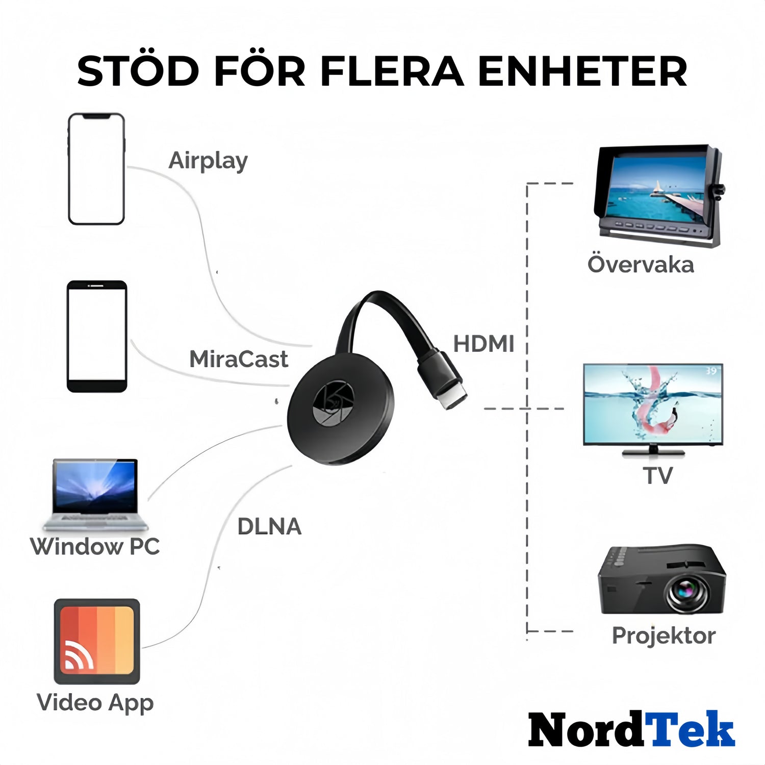 Upplev total frihet med Smartstickan™ – den smarta cast-enheten som låter dig streama direkt från din mobil, surfplatta eller laptop till TV:n, helt utan Wi-Fi.